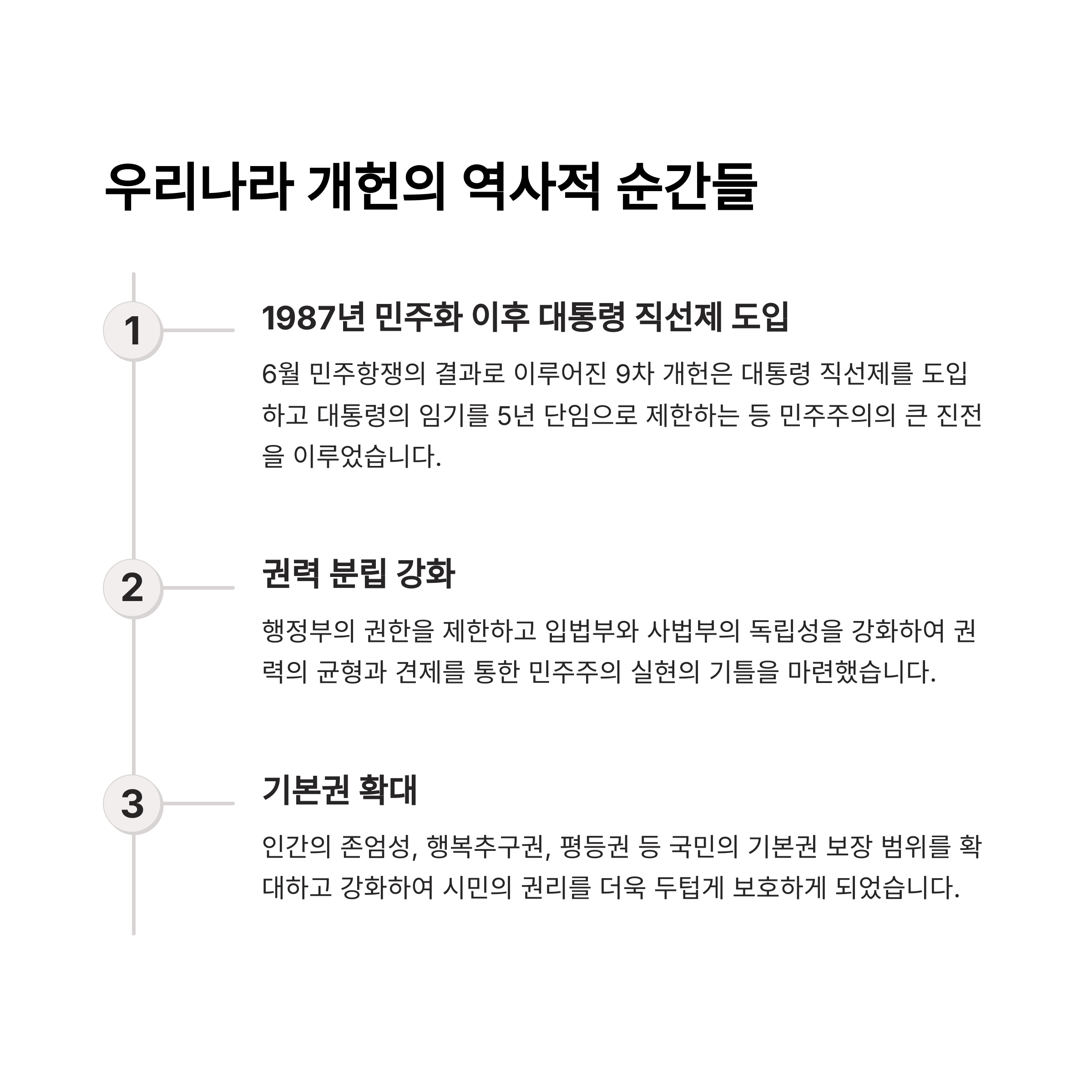 가장 최근은 1987년, 지금 우리가 쓰는 헌법이에요. 그때는 국민들이 대통령을 직접 뽑을 수 있게 만든 직선제 개헌이었죠.