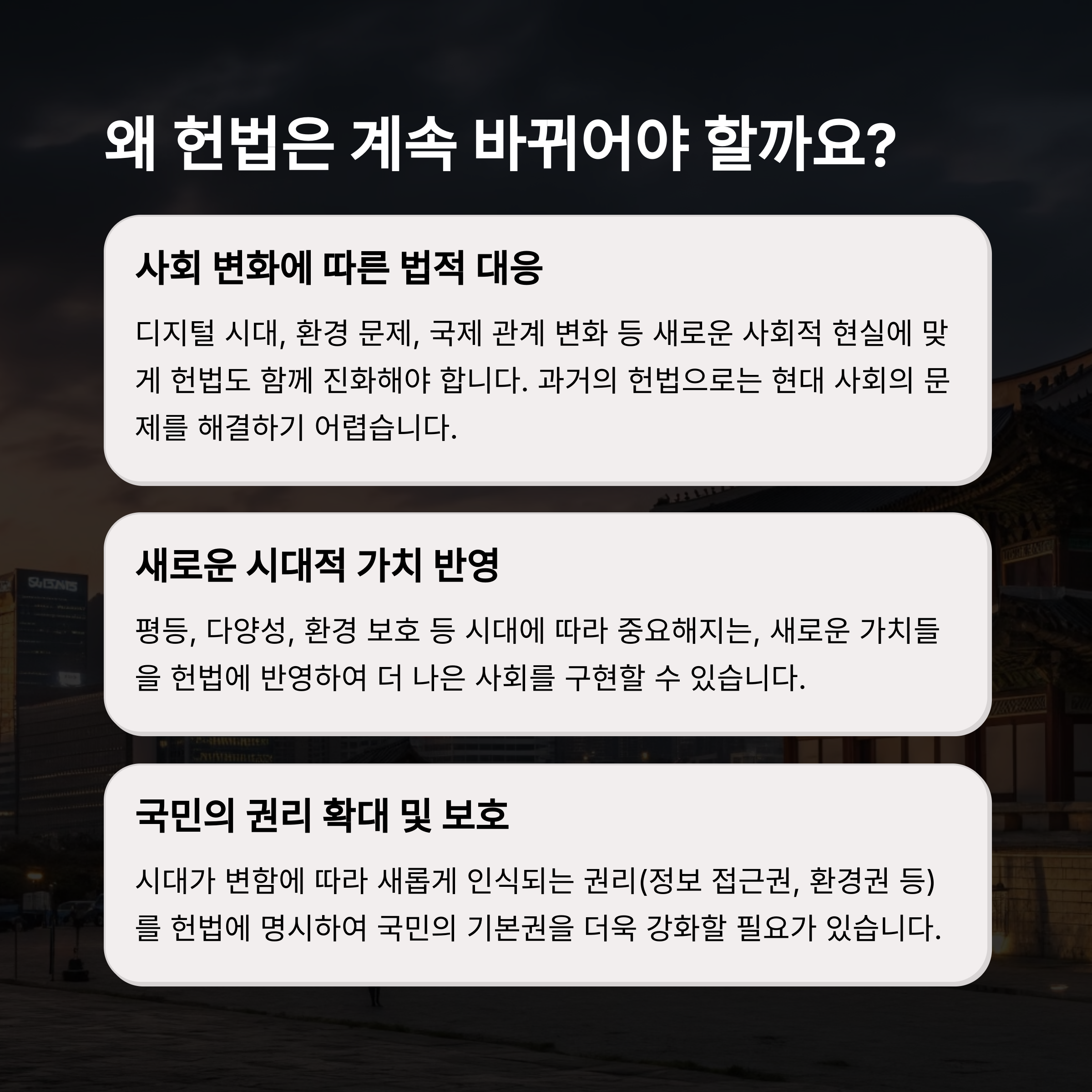 헌법이라고 영원불변한 건 아니에요. 다음과 같은 이유로 바꾸자는 얘기가 나올 수 있어요:
