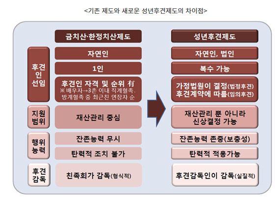 - 법원 결정에 따라 지정된 후견인이 재산 및 생활을 지원