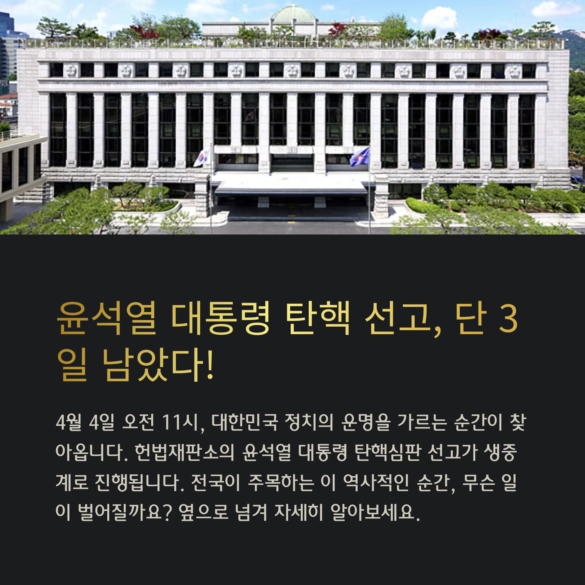 주요 정치 및 사회 뉴스   1. 헌법재판소, 윤석열 대통령 탄핵심판 선고일 4월 4일로 확정헌법재판소는 4월 1일 윤석열 대통령 탄핵심판 사건의 선고기일을 4월 4일 오전 11시로 공식 공지했다.