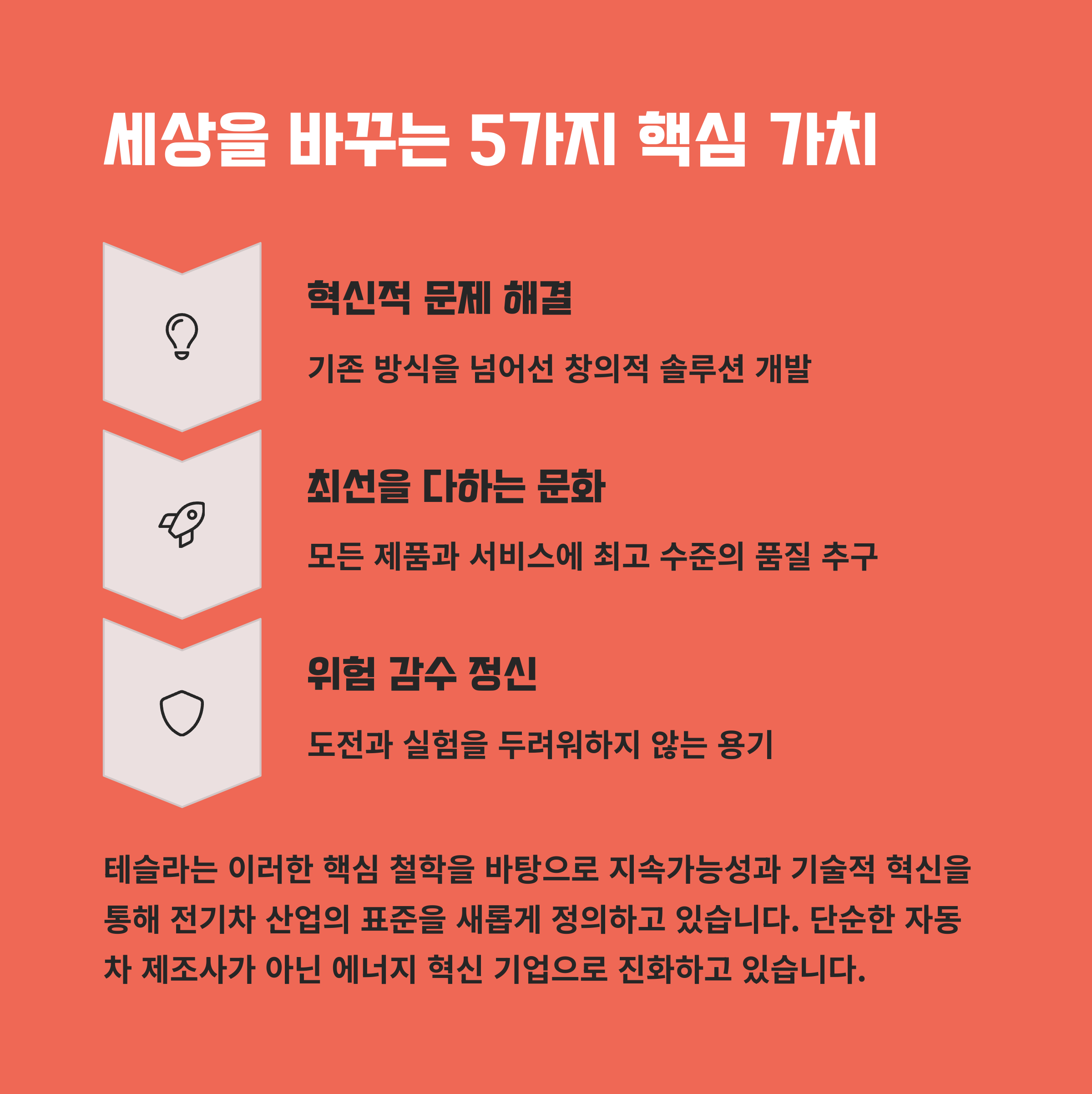 테슬라의 기업 철학은 다음과 같은 핵심 가치에 기반합니다: