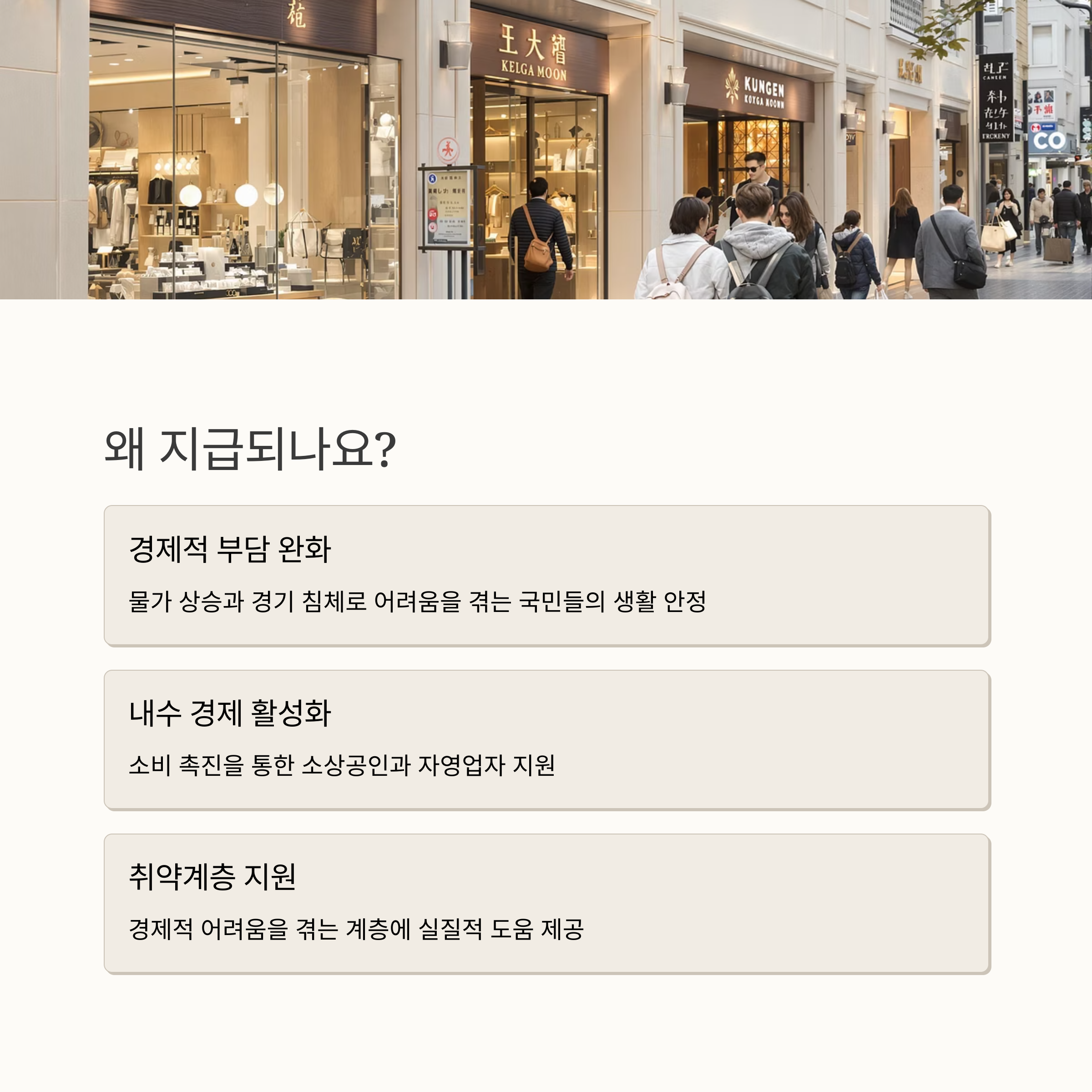 이 지원금은 가계 소득을 보전하여 기본적인 생활을 안정시키고, 소비를 촉진함으로써 소상공인과 자영업자에게도 긍정적인 영향을 미치는 것을 주요 목적으로 합니다.
