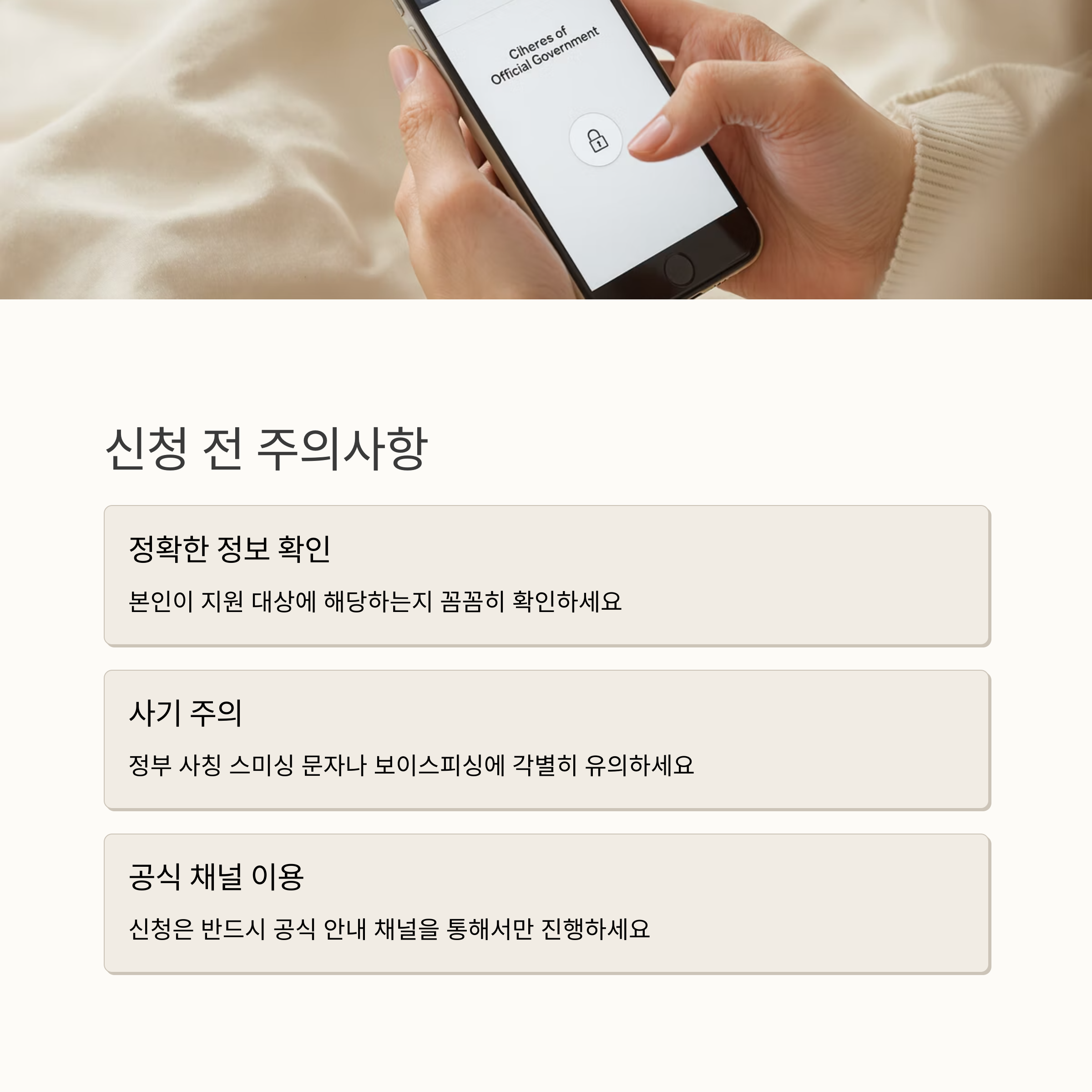 특히, 정부나 공공기관을 사칭한 스미싱 문자나 보이스피싱에 각별히 유의해야 하며, 지원금 신청은 반드시 공식 안내 채널을 통해서만 진행해야 합니다.