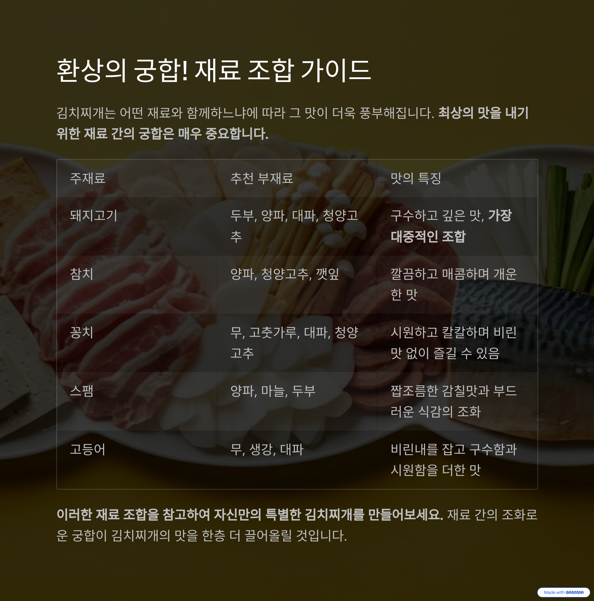 이러한 재료 조합을 참고하여 자신만의 특별한 김치찌개를 만들어보세요.