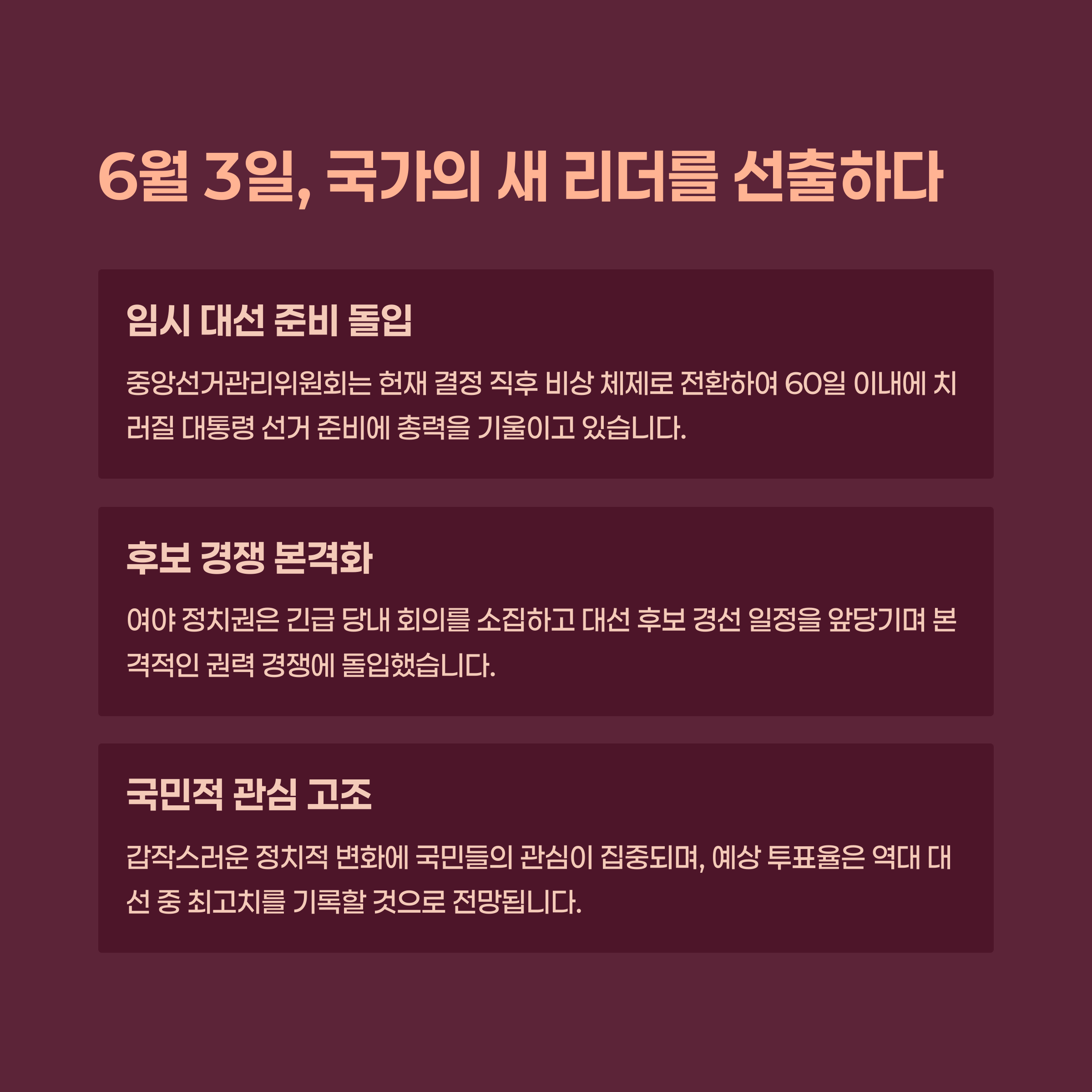 윤석열 전 대통령의 파면으로 오는 6월 3일 새로운 대통령을 선출하는 제21대 대통령 선거가 열립니다. 차기 대통령에 누가 당선될지 큰 관심이 쏠리고 있습니다.