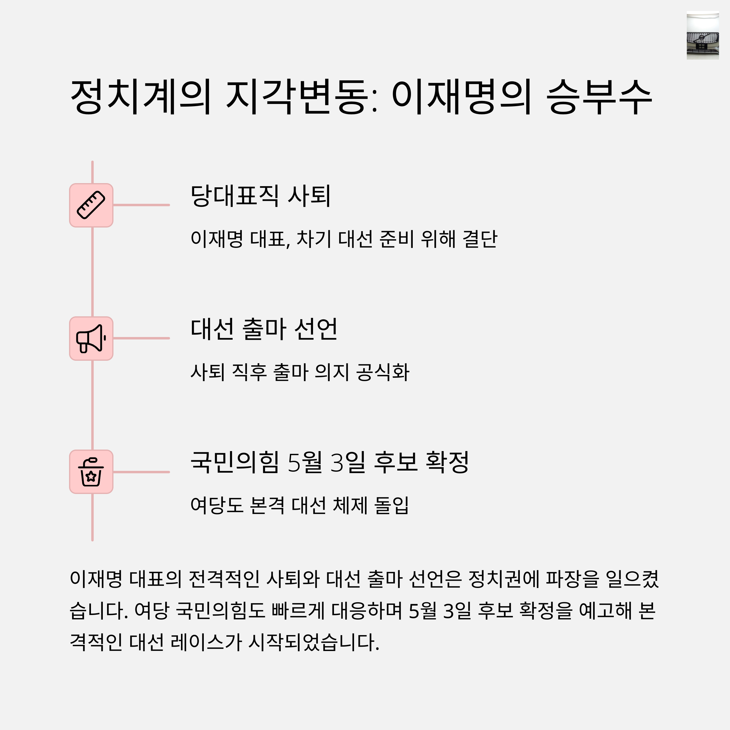 이재명 더불어민주당 대표가 전격 사퇴하며 대통령 선거 출마를 공식 선언했어요. “국민과 역경을 함께하겠다”는 말이 참 인상 깊었죠. 드디어 대선 국면이 본격화되는구나 싶습니다. 정치의 계절이 다가오는 게 피부로 느껴져요.