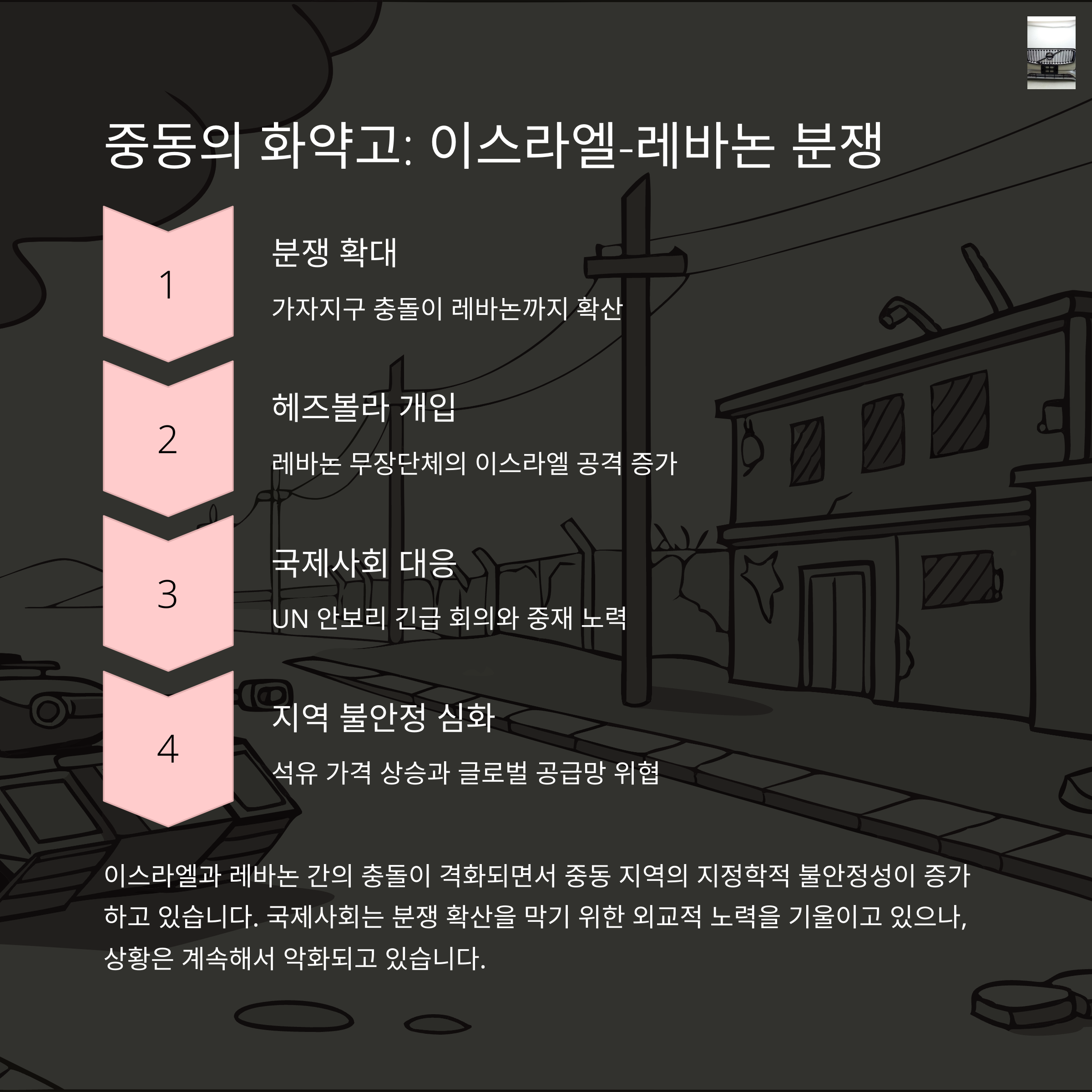 중동에서는 이스라엘과 레바논 사이의 무력 충돌이 격화되고 있어요. 헤즈볼라와의 긴장이 폭발 직전이고, 대규모 공습이 이어지고 있다고 합니다. 뉴스 볼 때마다 마음이 무거워지는 국제 정세입니다.