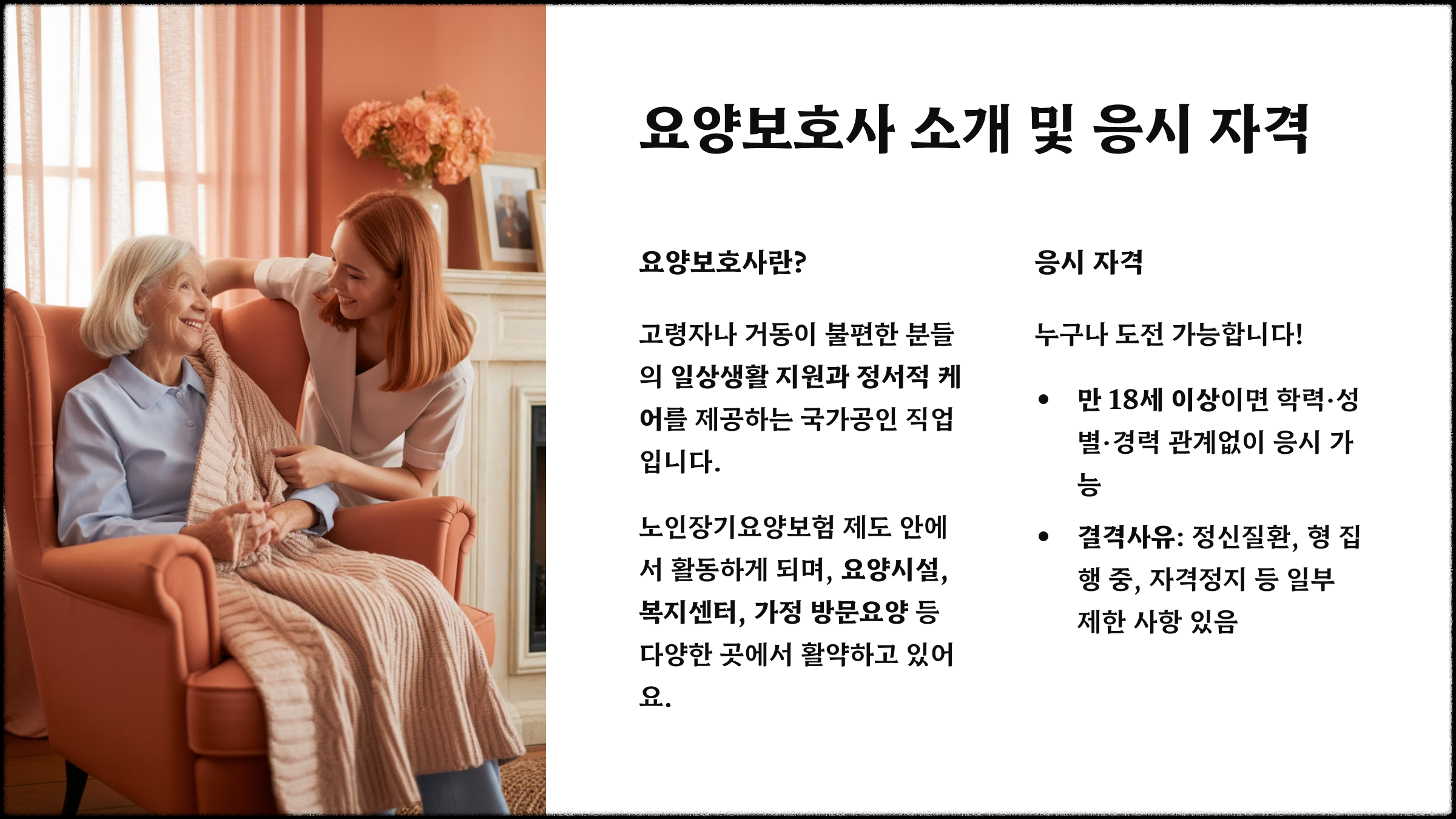 고령자나 거동이 불편한 분들의 일상생활 지원과 정서적 케어를 제공하는 국가공인 직업입니다.