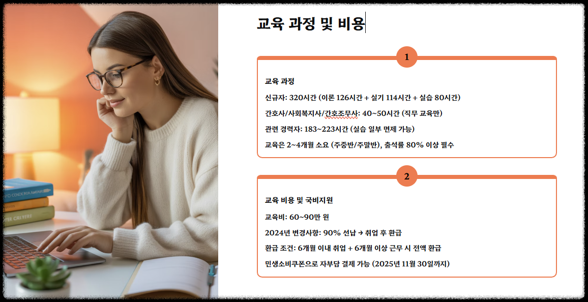 📍 요양보호사로 근무 시 월 60시간 이상 근무하면 교육비 전액 환급 가능!