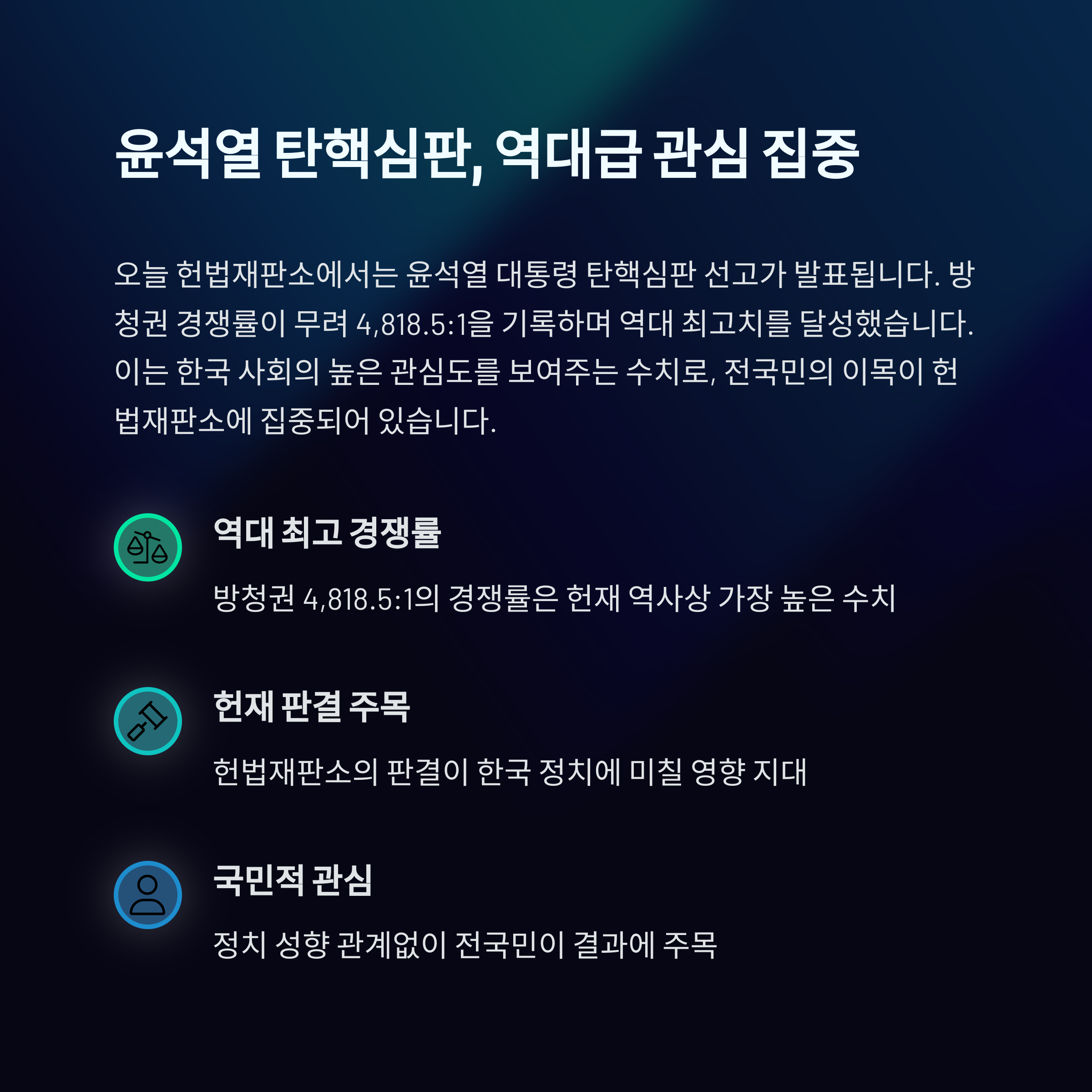 오늘(4월 4일) 헌법재판소에서 윤석열 대통령 탄핵심판의 최종 선고가 내려질 예정입니다. 이번 탄핵심판은 윤 대통령이 직권남용과 헌법 위반 혐의로 국회에서 탄핵소추안이 가결된 후 헌재로 넘어간 사건으로, 국민적 관심이 집중되고 있습니다. 헌재는 오전 10시 선고를 시작하며, 결과에 따라 한국 정치 지형에 중대한 변화가 예상됩니다. 방청권 경쟁률은 역대 최고치인 4,818.5:1을 기록해 국민적 관심을 반영했습니다.