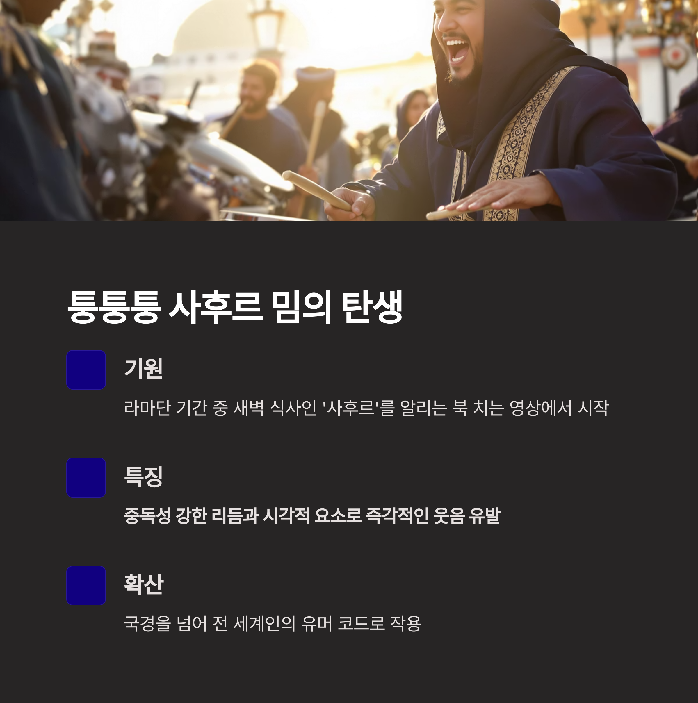 퉁퉁퉁 사후르 밈은 이슬람 문화권에서 라마단 기간 중 새벽 식사인 '사후르'를 알리기 위해 북을 치는 사람의 모습을 담은 영상에서 시작되었습니다.
