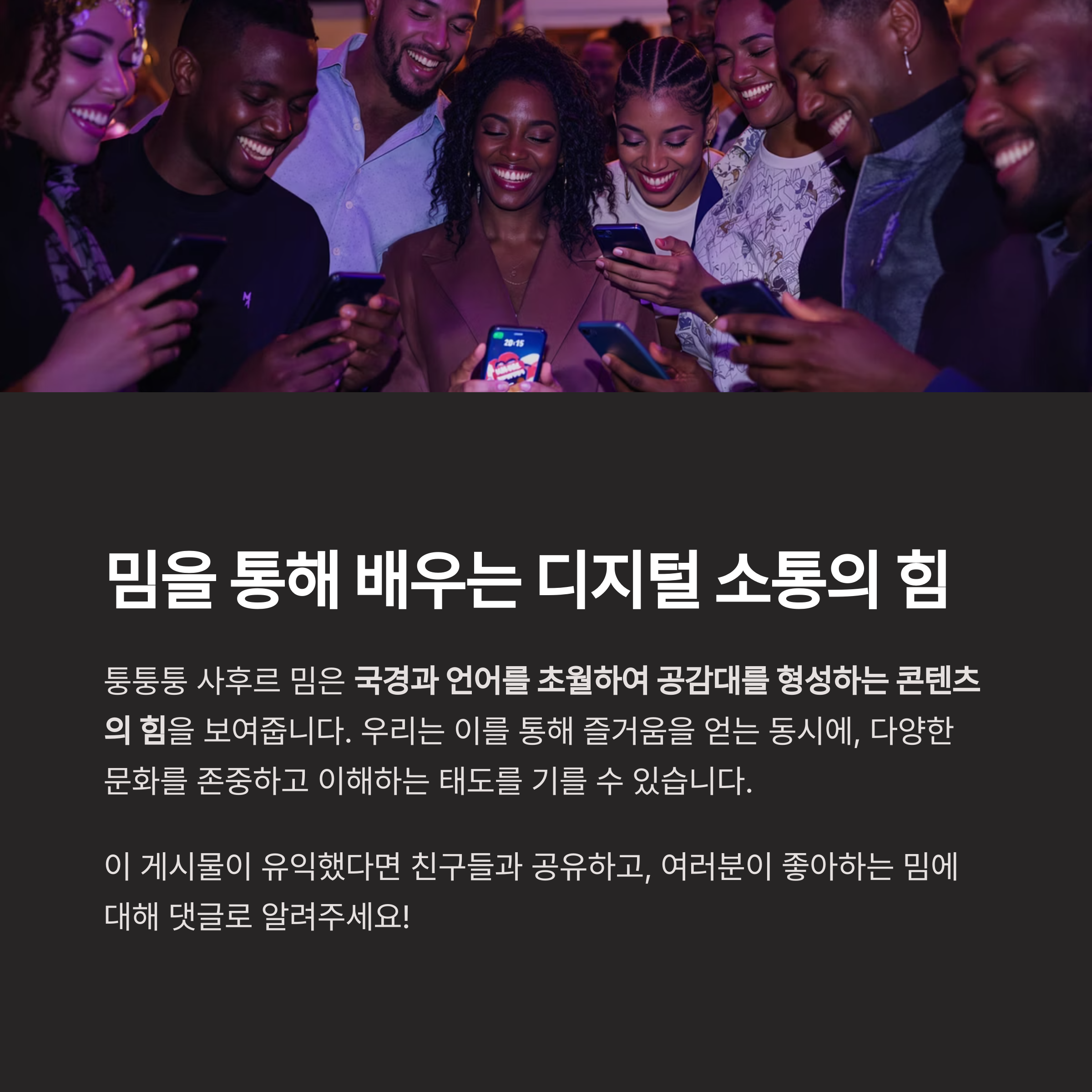 둘째, 밈 특유의 단순성과 반복성은 언어의 장벽을 넘어 직관적인 재미를 선사했습니다.