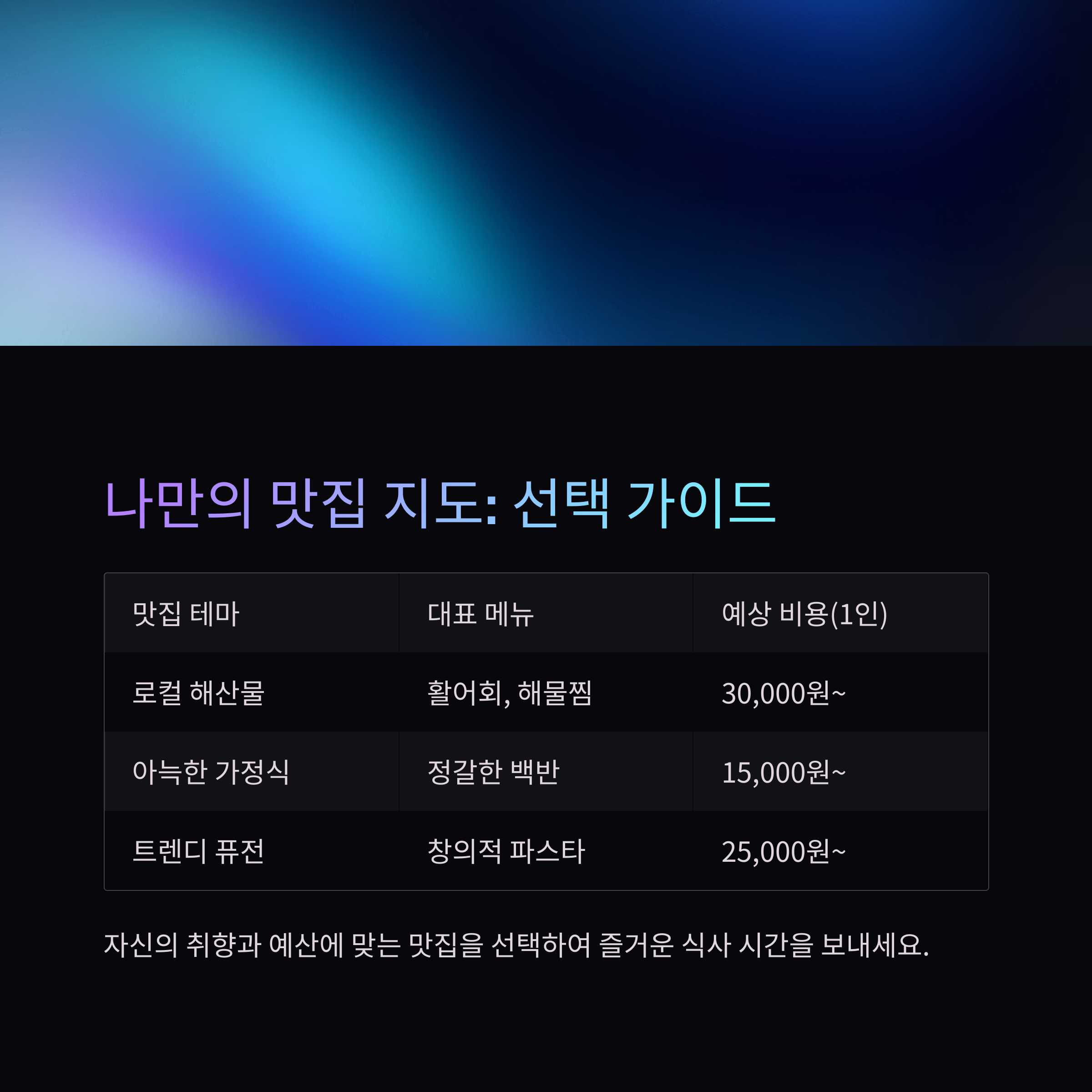 | 맛집 테마 | 대표 메뉴 예시 | 분위기 특징 | 예상 비용 (1인) |