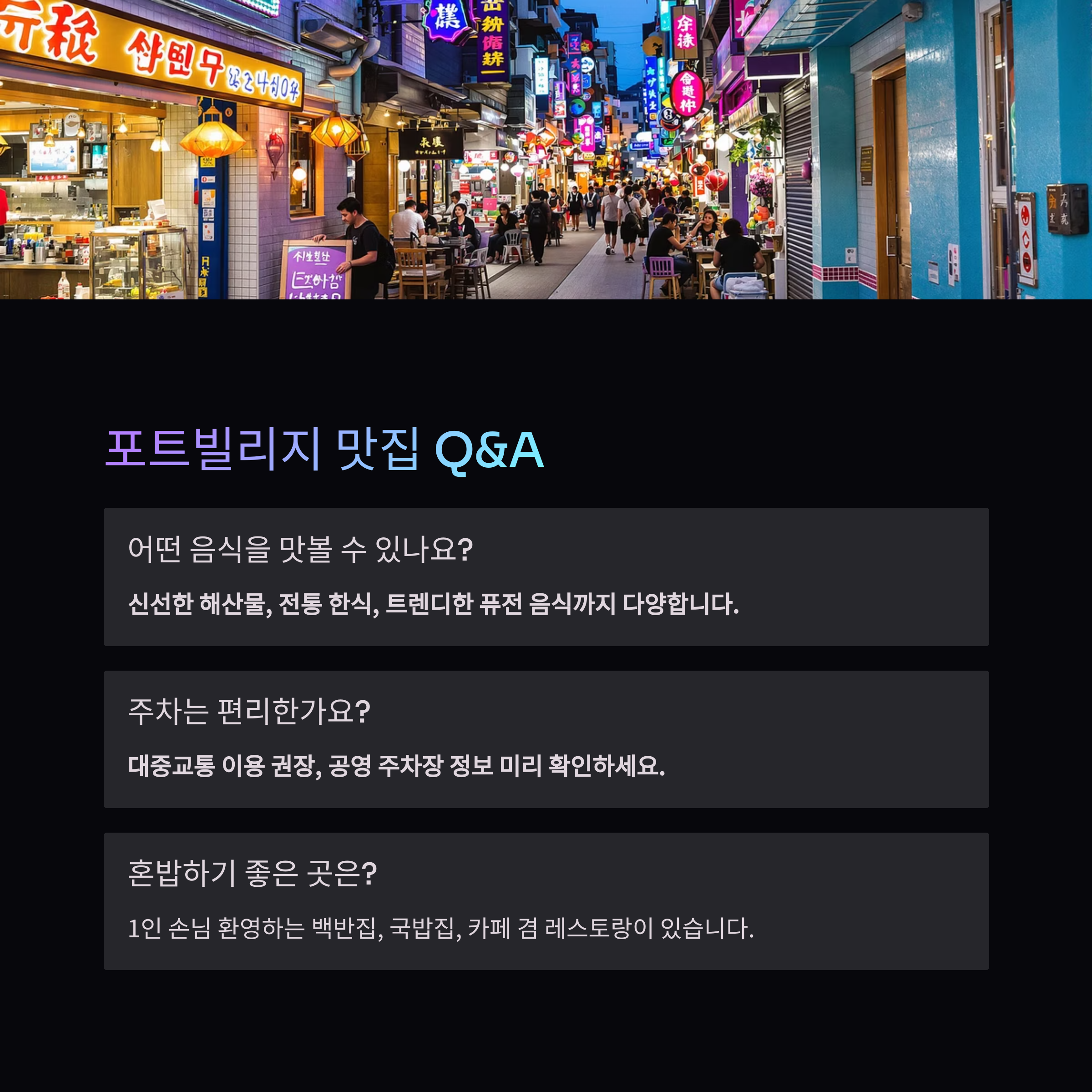 A: 포트빌리지는 항구 도시의 특성을 살린 신선한 해산물 요리부터 시작해서, 현지인들이 즐겨 찾는 전통 한식, 그리고 젊은 세대들의 입맛을 사로잡는 트렌디한 퓨전 음식까지 정말 다양합니다. 골목마다 개성 넘치는 식당들이 많으니 취향에 맞게 선택하는 재미가 있습니다.