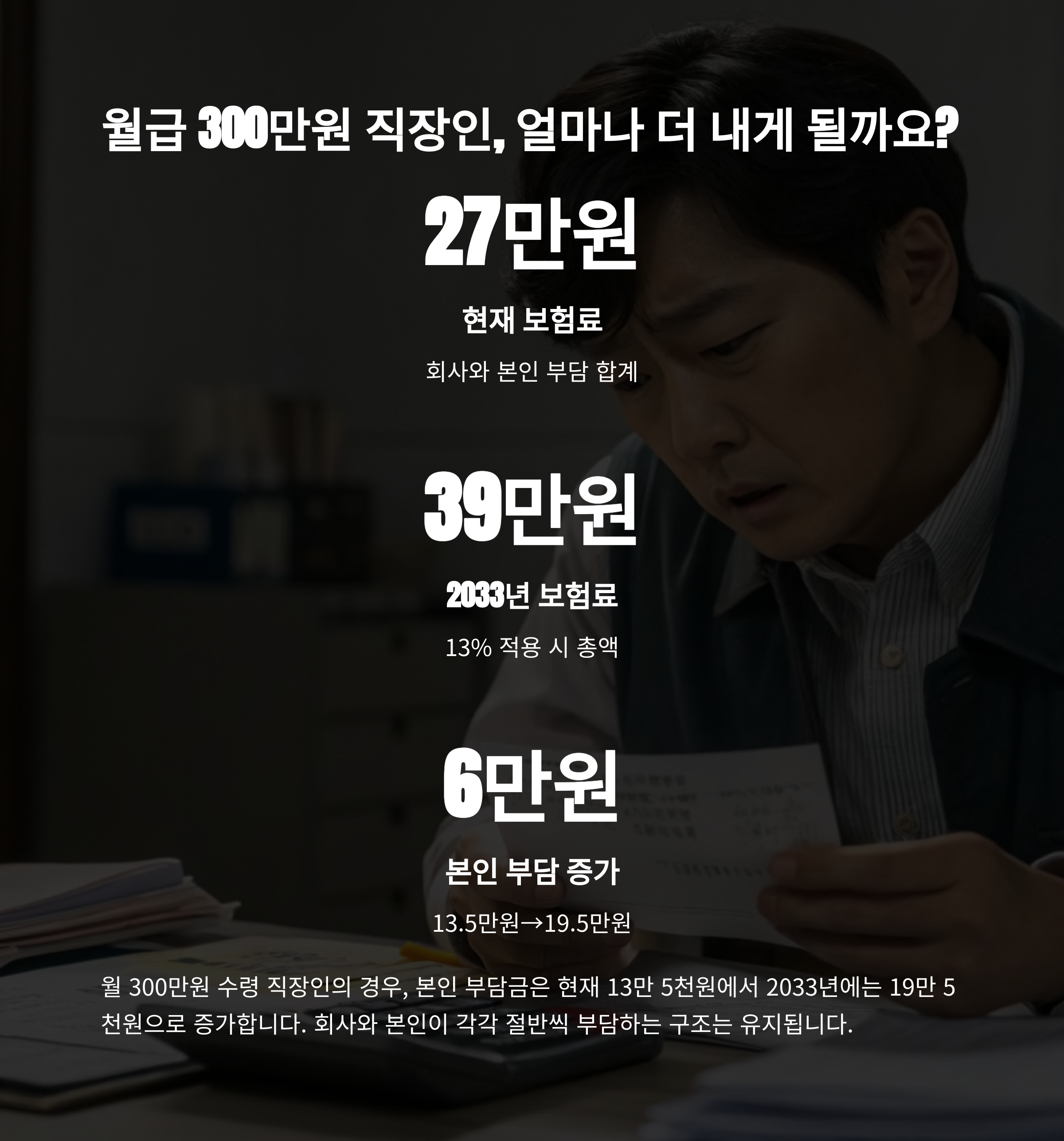 | 최종 13% 도달 시 월급 300만원 기준 6만원 인상 | 월 연금 수령액 9만원 상승 효과 발생 | 보험료 상·하한액 기준도 함께 조정됨 |