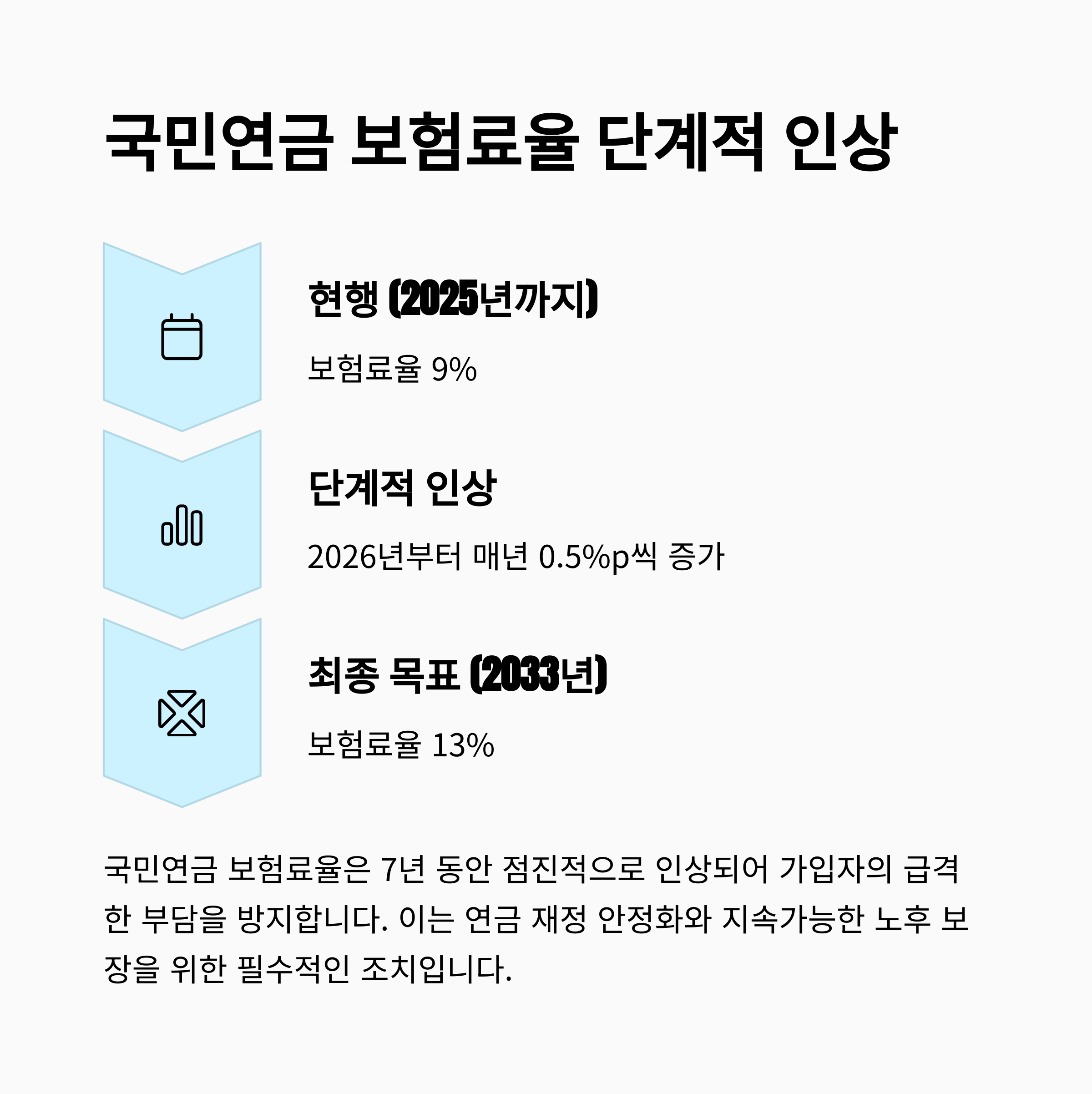| 국민연금 보험료율 인상 | 2026년부터 매년 0.5%씩 2033년까지 인상됩니다. |