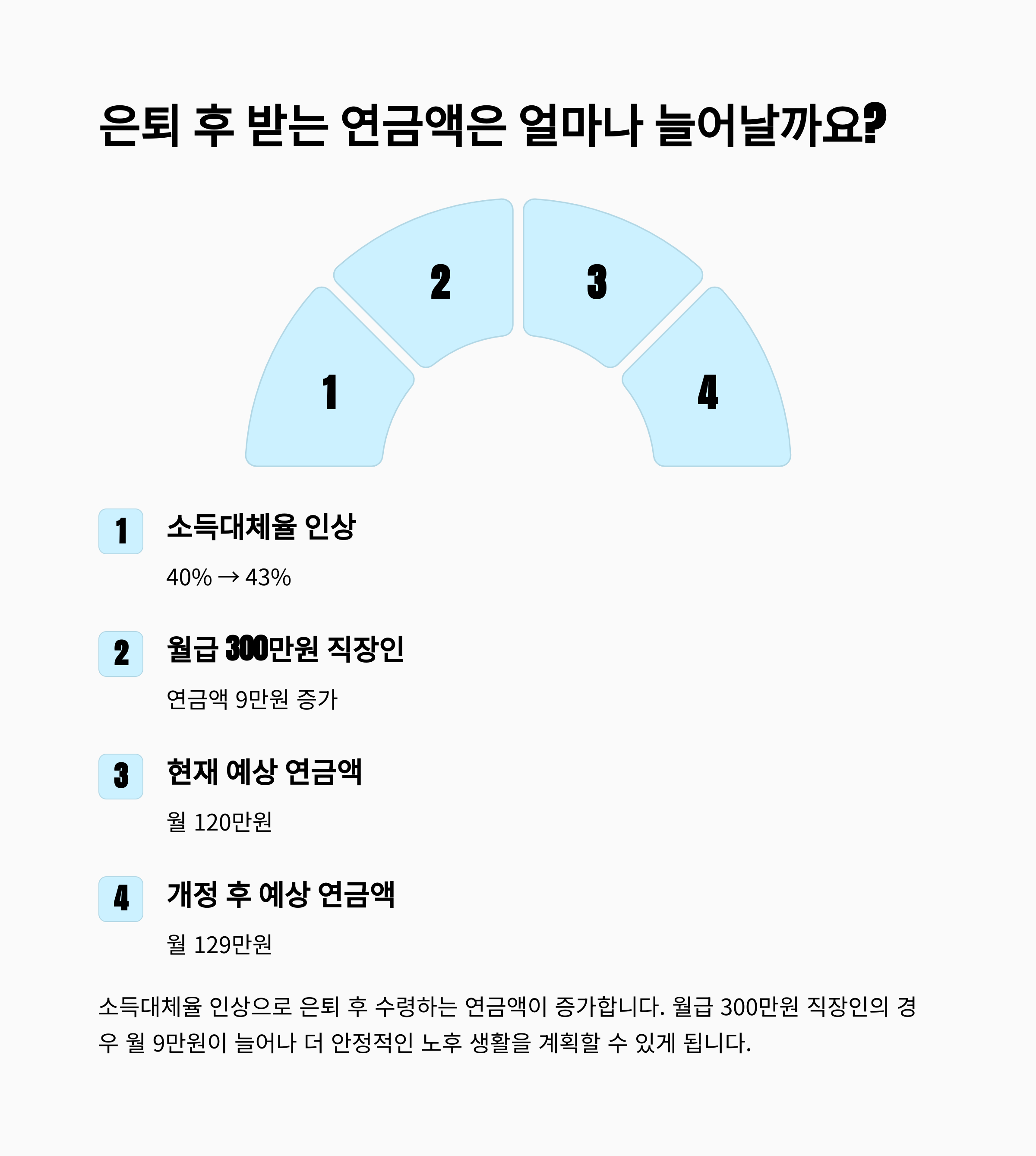 | 소득대체율 증가 | 40%에서 43%로 올라, 수령 연금액이 높아집니다. |