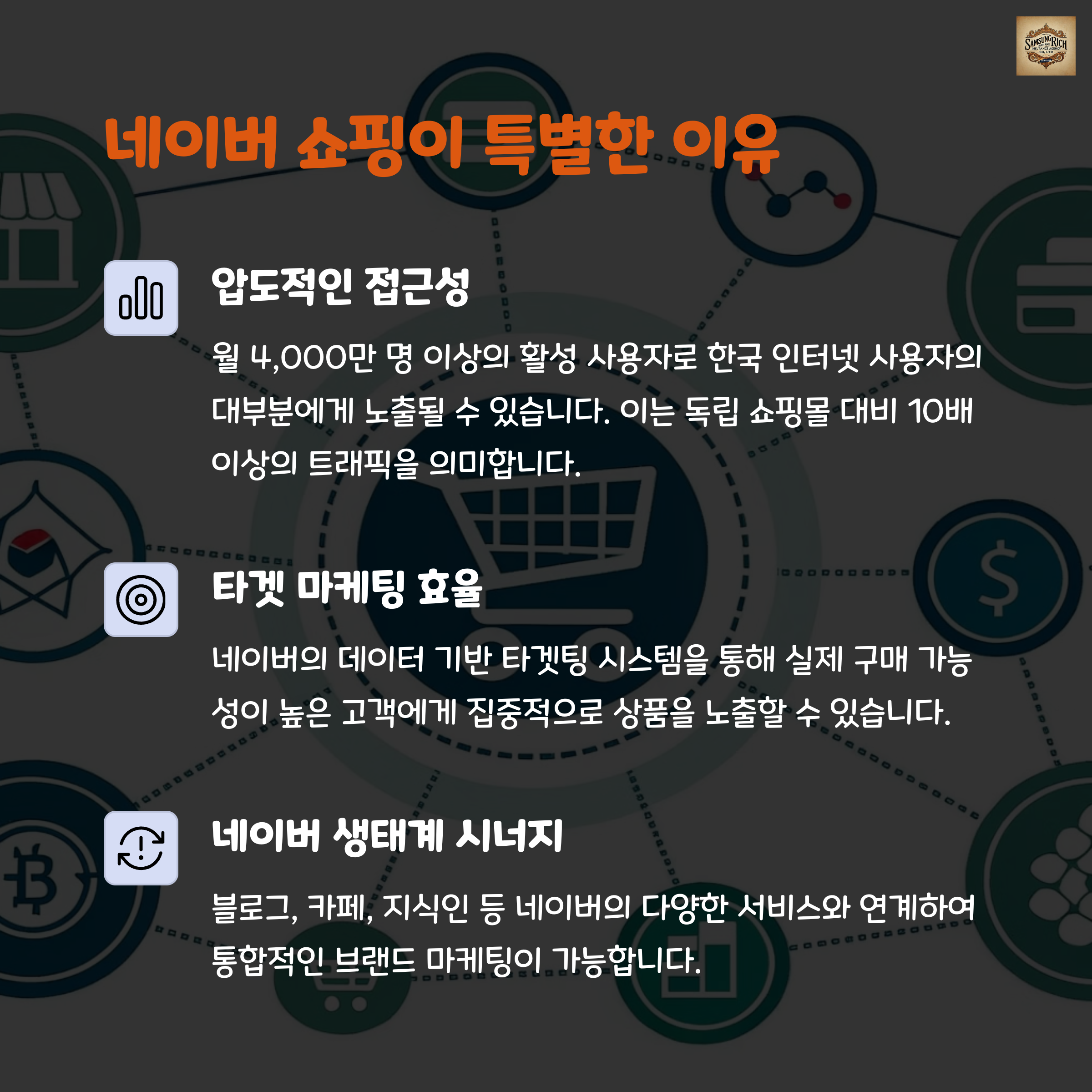 | 광범위한 사용자 기반 | 네이버는 월간 4,000만 명 이상이 사용하는 강력한 온라인 쇼핑 플랫폼입니다. |