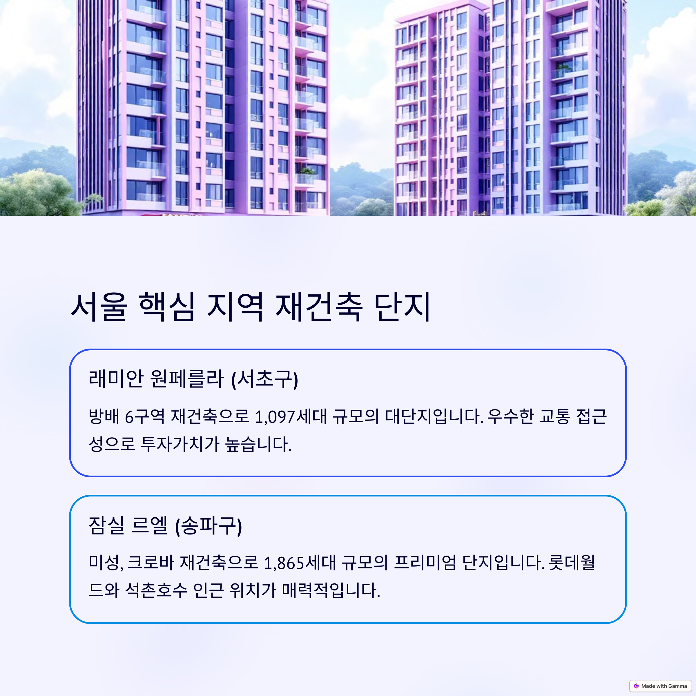 | 투자 포인트 | 브랜드 아파트, 재건축 대단지, 교통 호재, 시세차익 기대 |