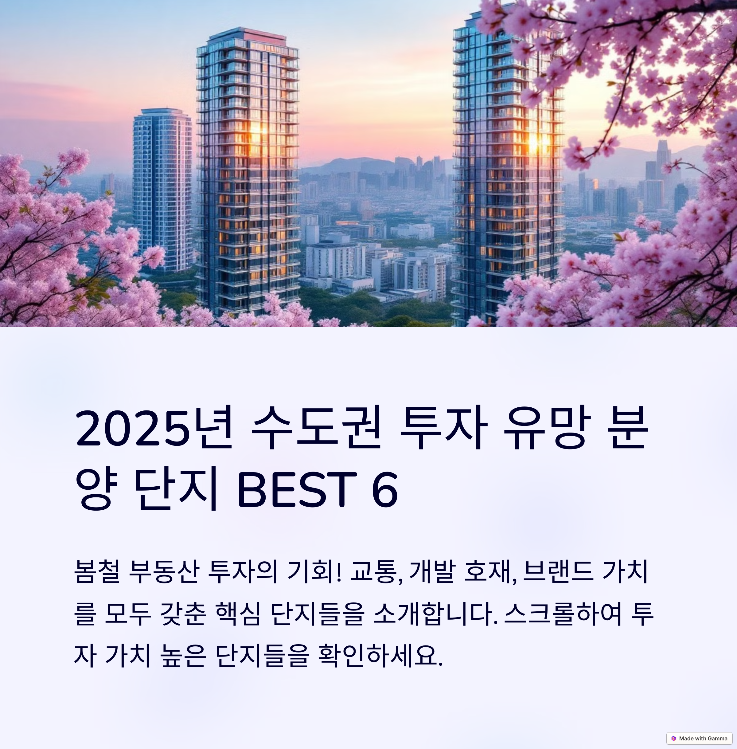 2025년 봄철 수도권에서 주목할 만한 분양 단지를 소개합니다. 교통 인프라, 개발 호재, 브랜드 가치 등으로 투자 가치가 높은 단지들입니다.