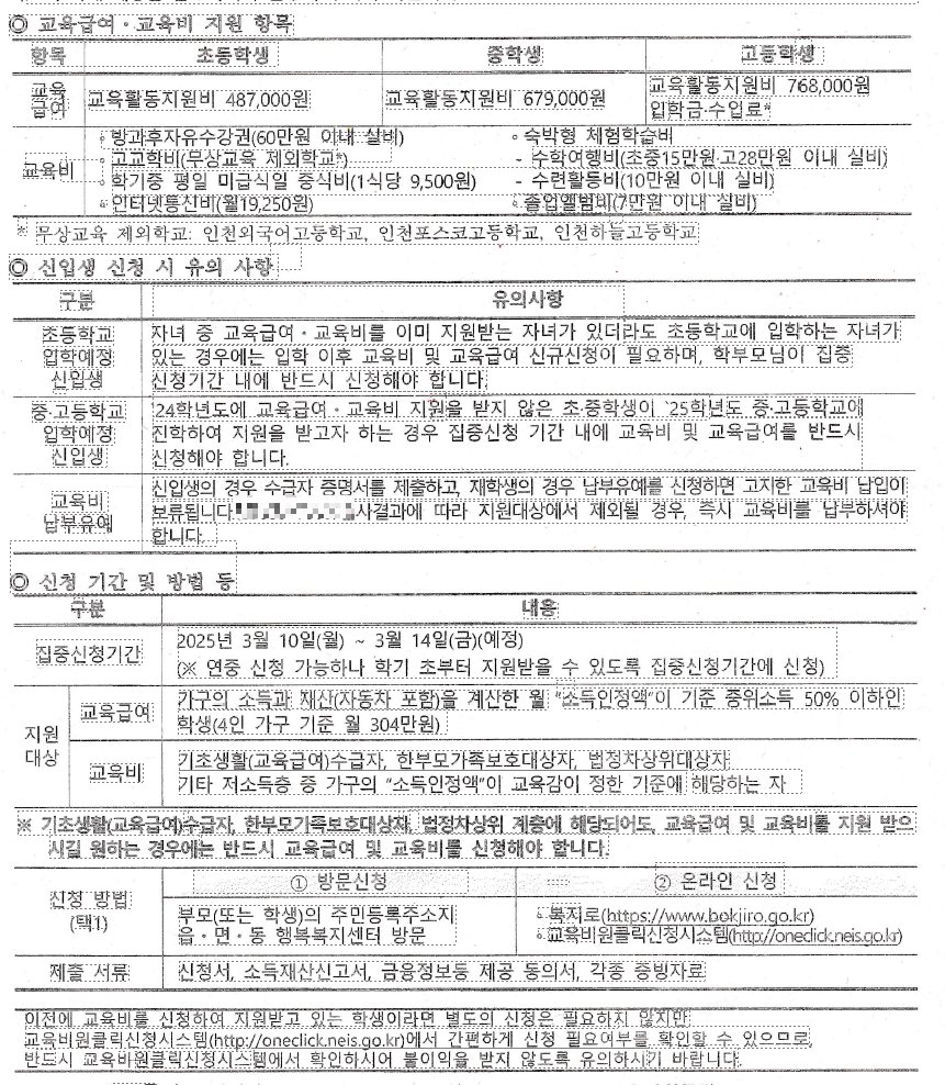 - 기초생활수급자라도 반드시 교육비 및 교육급여를 신청해야 지원을 받을 수 있습니다.